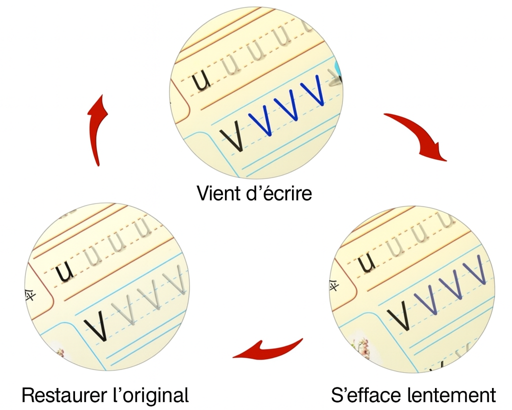 l’encre disparaît et l’enfant peut réessayer autant de fois qu’il veut.